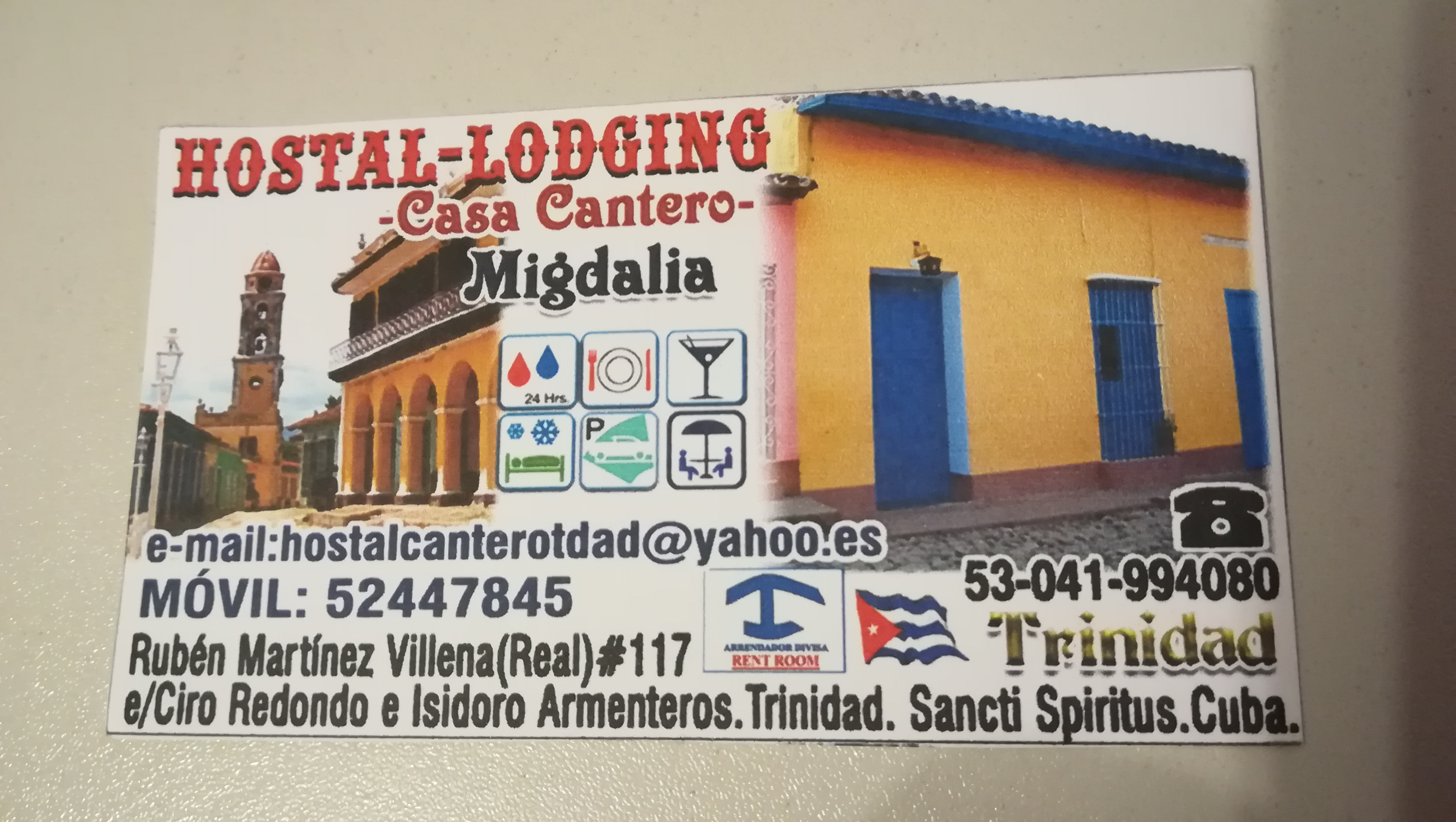 Trafiliśmy na świetną Casa Cantero, a właściwie znalazła nas jej właścicielka Migdalia. Jak ona gotuje! „Miód w gębie”. Nie warto nigdzie jeść na mieście. Oprócz tego oferuje bardzo czyste i ładne pokoje z łazienkę. Uważajcie tylko na bardzo śliskie po deszczu schody z tarasu na dachu. Darek się poślizgnął i złamał sobie palec. Zeskanowałam wizytówkę Migdalii, może Wam się przyda, jak będziecie w Trinidadzie .